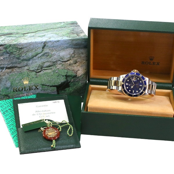 サブマリーナの中でも人気が高い、通称”青サブ”こと高級腕時計ロレックスサブマリーナのコンビモデルです。ゴールドとブルーのゴージャスな煌めきが、ダイバーズウォッチながら高級さを手元に演出します。生産終了モデルの為、お早めに!!