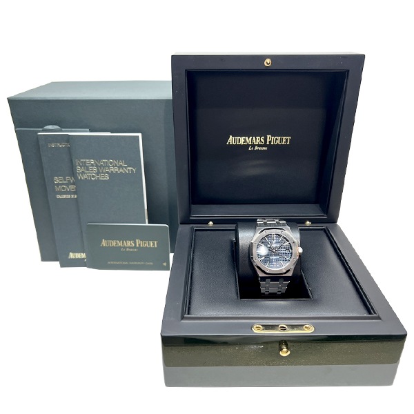 ブルーカラーの「グランド・タペストリー」文字盤にホワイトゴールドのアプライドインデックス、センターセコンドにロイヤルオーク針の王道スタイルのモデルでございます。八角形のベゼルを六角形のビスで留めているなど大胆なデザインが魅力的。雰囲気のある上品な印象はオーデマピゲならではです。22Kゴールド製ローターの自社製自動巻きキャリバー3120を搭載しています。フォーマル・カジュアルとあらゆるシーンで活躍してくれる一本です。
