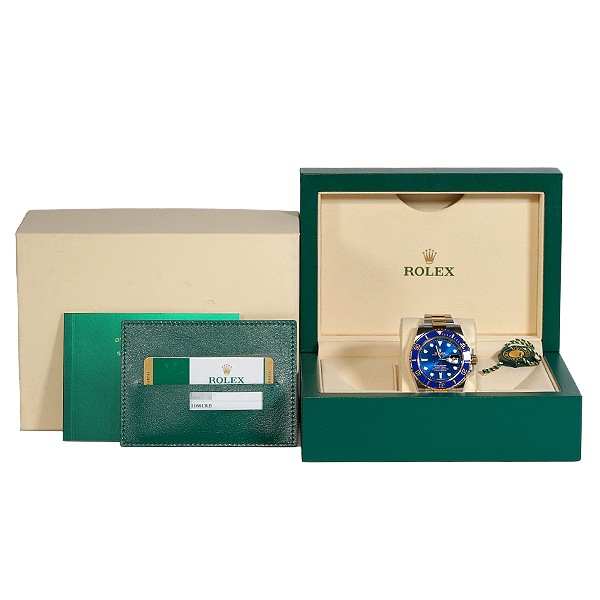 2009年のバーゼルフェアで発表された注目の新青サブ。16613に比べ堅牢性が増しセラミックベゼルが高級感漂うモデル。こちらはイエローロレゾールと呼ばれるイエローゴールドとステンレスを組み合せたモデル。ブルー文字盤はマイナーチェンジが行われ、中央部から放射線状に光を反射させるサンバーストダイアルに変更されました。