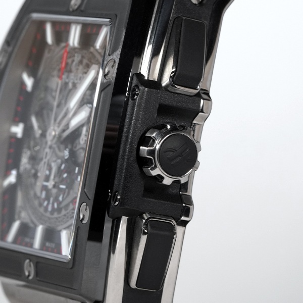 ウブロから「スピリット オブ ビッグバン チタニウム セラミック」が入荷致しました。ムーブメントには、ウブロとゼニスがコラボレートして作られた、「エルプリメロ」ベースのクロノグラフムーブメント「HUB4700」を搭載。 ケースバックがシースルーになっているため、その精密な動きをご覧頂けます。